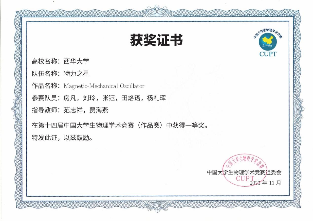 第十四届中国大学生物理学术竞赛作品赛于8月25日至10月1日,进行CUPT2023作品征集。近日,评审及结果已公示。betway西汉姆联平台由范志祥老师、贾海燕老师指导的“物力之星”代表队(参赛队员:房凡,刘玲,张钰,田烙语,杨礼珲)的参赛作品“磁性机械振荡器(Magnetic-Mechanical Oscillator)”斩获国赛一等奖。