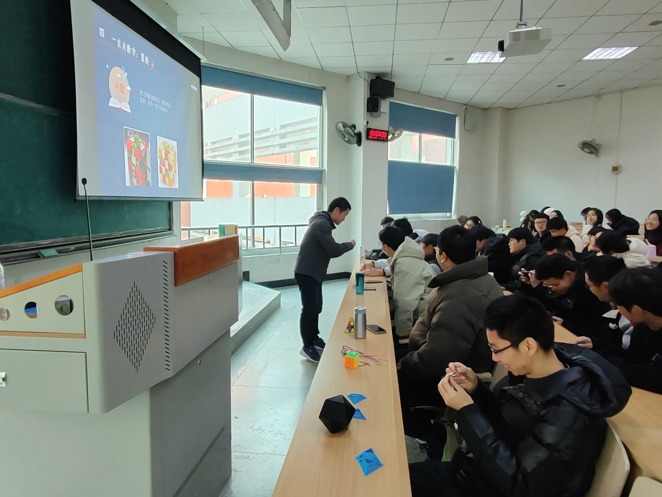 作为目前一种风靡全球的智力玩具,世界各地对魔方有着长期探索与开发。会议上李尧其老师从魔方的历史、魔方的类别、创新玩法和数学、置换四个方面向全体成员进行了详细介绍。李尧其老师针对不同类型的魔方进行了演示与教学,展示了魔方的多样玩法,同时剖析了藏在魔方里的数学知识,并希望同学们能够学以致用,不仅要努力学习专业知识,还要把数学带出课本,应用到实践中。