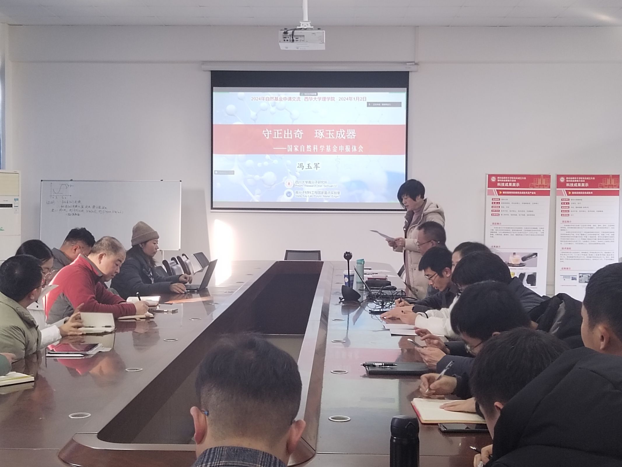 会议伊始,冯玉军教授讲解了大家对国家自然基金申报理解上的几个误区,阐释基金申报是一项系统工作,申报基金比拼的是综合实力等。随后,冯玉军教授强调在撰写基金申请书时,要力争达到拟申报课题非研究不可和拟申报课题非撰写者研究不可的目的,并介绍了在撰写过程中如何更好地进行逻辑构造和语句表达的技巧,同时提醒与会者注意拟申报的国家自然科学基金是否是“基础研究”,是否具有创新点或重要研究价值,支持创新点的关键研究基础是什么等基本问题。会议最后,冯玉军教授和参会者师生进行了探讨和交流,他鼓励大家要坚持申报,及时总结经验,积极修磨锻炼。