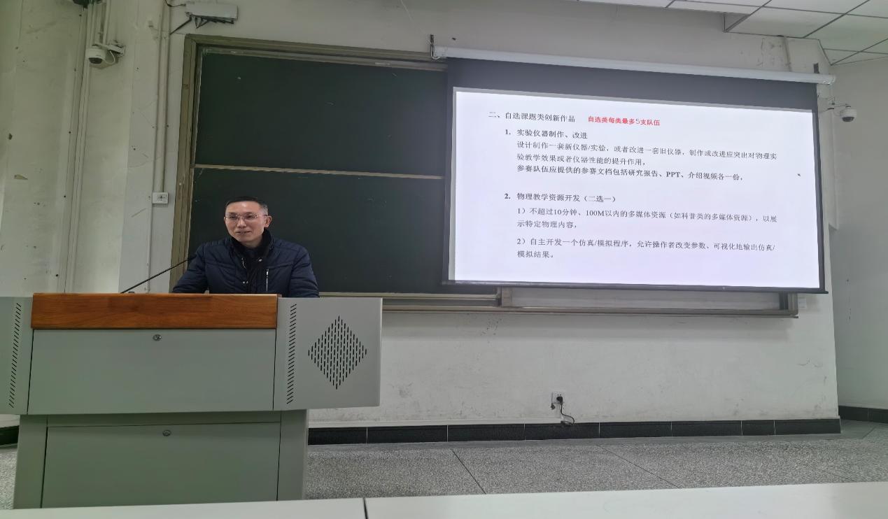 会上,物理实验中心主任迭东详细分析了本届比赛的各类赛题,并结合赛题,介绍了实验中心的资源配置情况。他指出,实验中心将提供丰富的实验设备和资源支持,确保参赛选手能够充分发挥自己的想象力和创造力。随后,强调了备赛的重点、注意事项和团队合作的重要性,鼓励选手们在备赛过程中注重实践操作的细节和技巧,同时要学会思考和解决实际问题,积极与队友合作,共同攻克比赛难题。