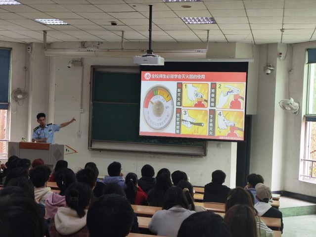 接下来,袁健老师重点为同学们讲解了如何正确使用灭火器以及火灾中的逃生要点。他告诉同学们,面对火灾,要学会使用灭火器、灭火器材等设备,牢记“握、压、提、拔”四个字;逃生时要保持冷静,迅速判断火势和逃生方向,遵循“就近、就快、就低”的原则,选择安全的逃生通道。