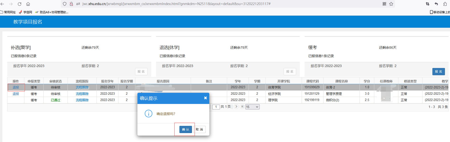 五、撤销缓考。 所有的撤销工作须在课程开考前完成。若审核状态为“待审核”的可直接点击【退报】按钮来撤消;若审核状态为“审核中”或“审核通过”的,可写书面申请联系后续审核人进行 “撤销审核”工作。