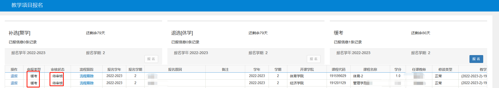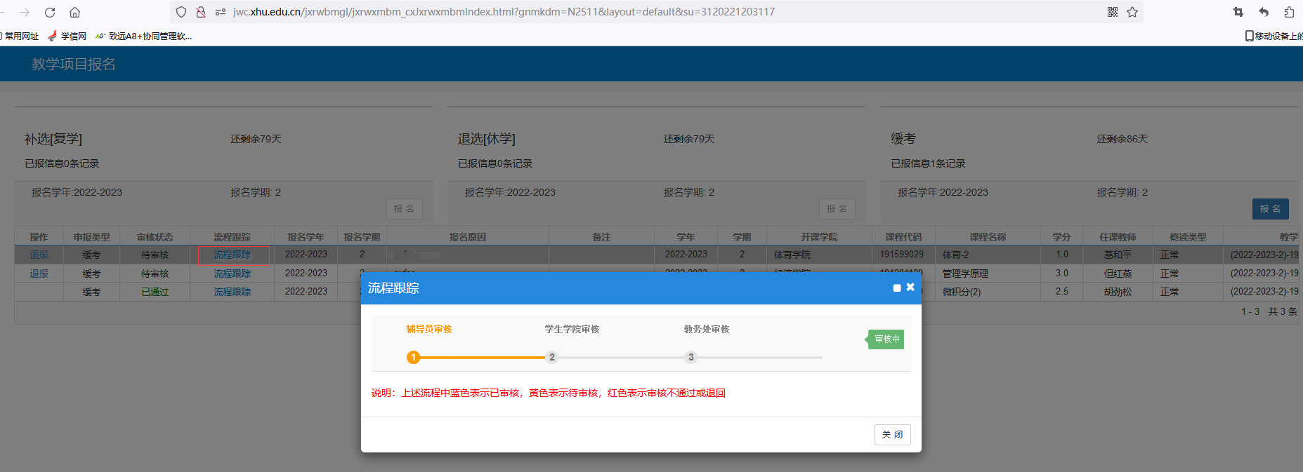 四、流程跟踪。缓考申请需辅导员、学生学院教学院长、教务处三级审核。可通过点击【流程跟踪】查看流程进度。若审核状态为“审核通过”则表示课程缓考申请办理成功。