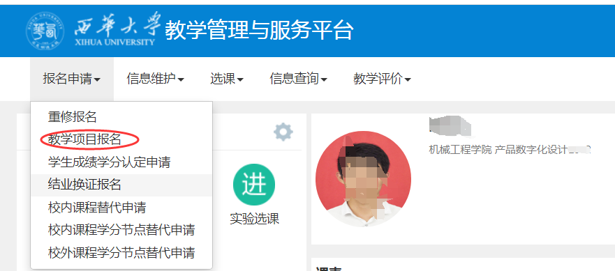 一、登录教务管理系统(http://jwc.xhu.edu.cn),选择【报名申请】--【教学项目报名】