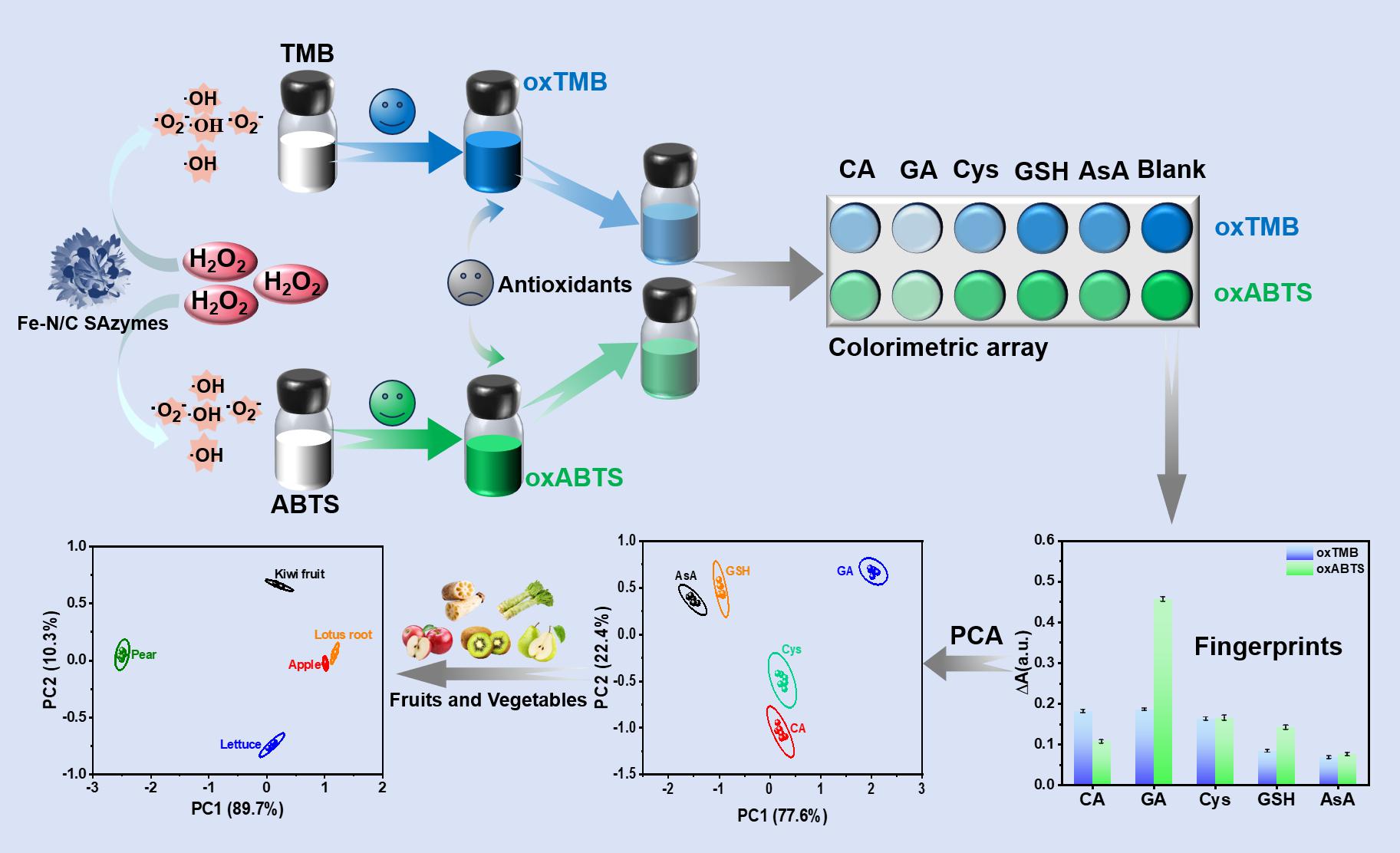 方案:基于Fe-N/C纳米酶的比色传感器阵列在果蔬抗氧化剂鉴定的原理图