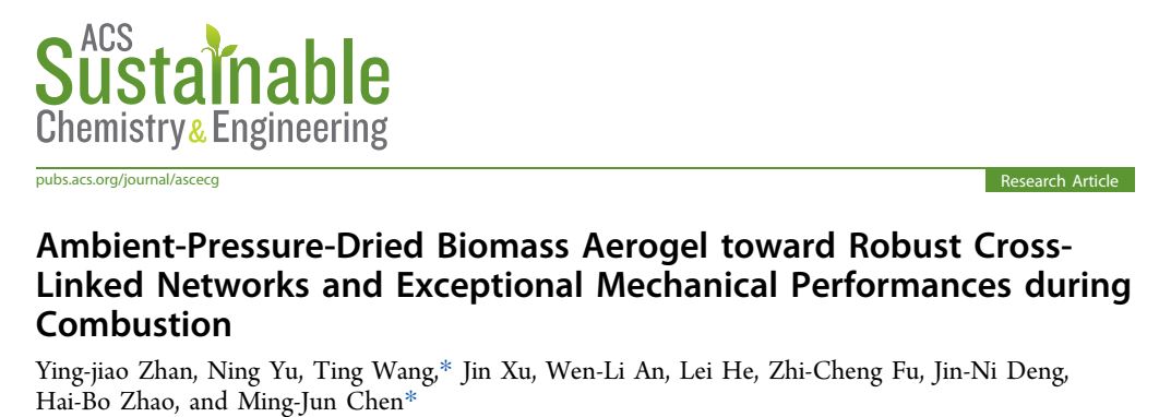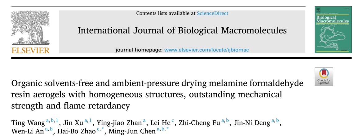 此外,创新地利用聚合物原位聚合三聚氰胺甲醛树脂的方法,成功实现兼具强度和韧性的三聚氰胺甲醛树脂的合成,实现无溶剂置换的常压干燥法制备高强度本征阻燃的三聚氰胺甲醛树脂气凝胶材料。其发表在材料科学领域主流刊物International Journal of Biological Macromolecules (中科院1区TOP,IF: 7.7)上, 该工作第一作者为betway西汉姆联平台汪婷副教授和betway西汉姆联平台2024届化学与生物医药硕士徐津,通讯作者为四川大学赵海波教授和陈明军教授,西华大学为第一单位 (见图3)。