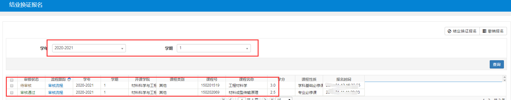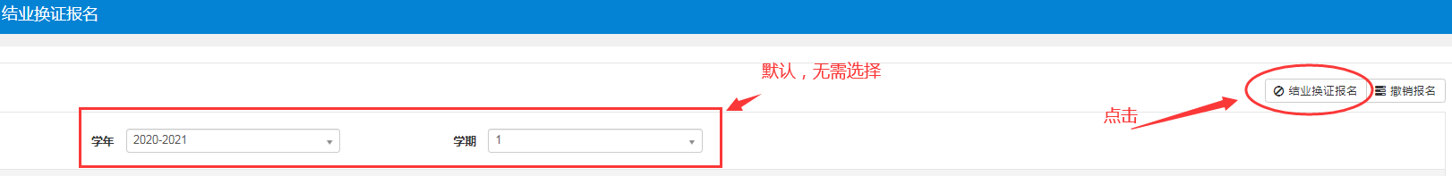 进入如下界面,学年学期保留默认情况,无需选择,点击右上角结业证换证报名,见图2。