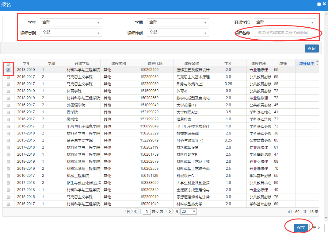 具体科目可以通过学年学期、课程代码或下面的翻页等方式查询,勾选所需报名科目保存即可,见图3。