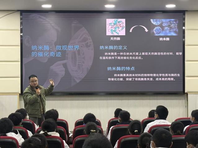为点燃中学生科学探索热情,2025年12月8日,西华大学betway西汉姆联平台化学系张国麒老师走进郫都区第四中学,开展了主题为 “纳米酶—那么美” 的科普讲座。全校百余名师生现场聆听,沉浸式感受前沿化学的魅力。