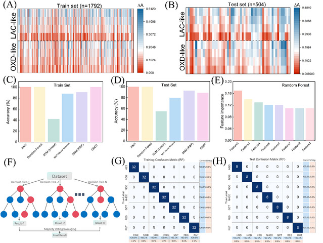 图5所示。随机划分的训练集(A)和测试集(B)的热图。各种算法在评估训练集(C)和测试集(D)时的准确率,包括KNN、RF、SVM、MLP神经网络、SNM、GBDT算法。(E)随机森林分析中传感器阵列特征的重要性。(F)随机森林算法示意图。训练数据(G)和测试数据(H)的混淆矩阵。