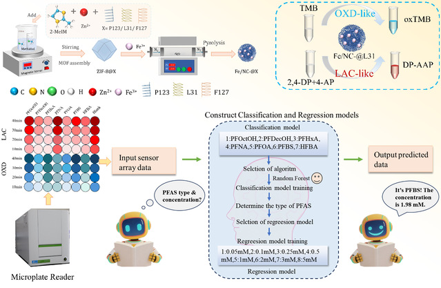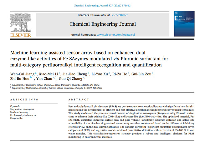 近日,西华大学betway西汉姆联平台张国麒团队在国际权威期刊《Chemical Engineering Journal》(中科院一区Top,IF=13.2)上发表了一项题为“Machine learning-assisted sensor array based on enhanced dual enzyme-like activities of Fe SAzymes modulated via Pluronic surfactant for multi-category perfluoroalkyl intelligent recognition and quantification”的研究性论文,西华大学2023级化学专业研究生蒋文彩为第一作者,betway西汉姆联平台数学系侯智博博士、化学系赵艳教授和张国麒博士为该论文的通讯作者,西华大学为第一通讯单位。