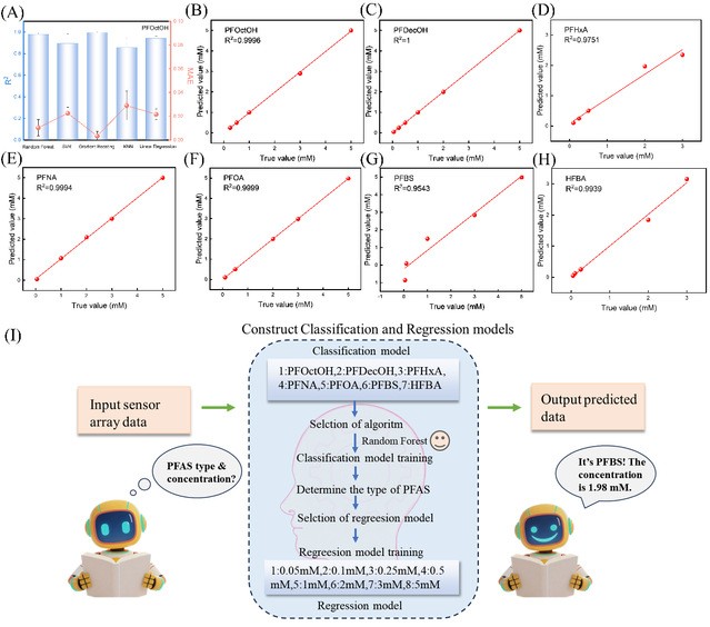 图6所示。(A) 针对于预测PFOctOH的不同算法的R2和MAE比较。(B-H)机器学习采用相应的最优回归模型对PFAS类型进行分析后预测7种PFAS浓度的回归结果。(I)分类回归模型预测示意图。