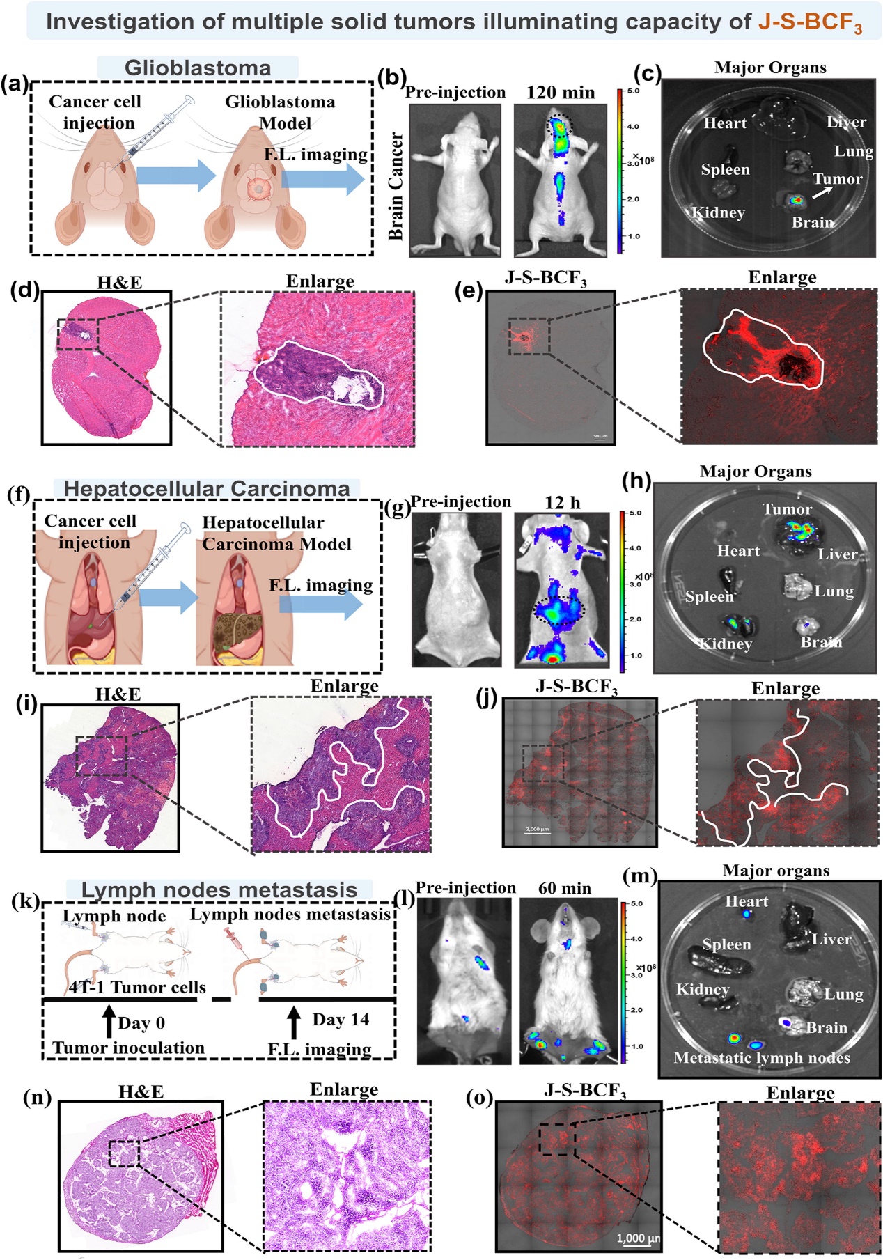 图3 探针J-S-BCF3对原位肿瘤(胶质瘤、肝癌和乳腺癌)的体内荧光成像评价