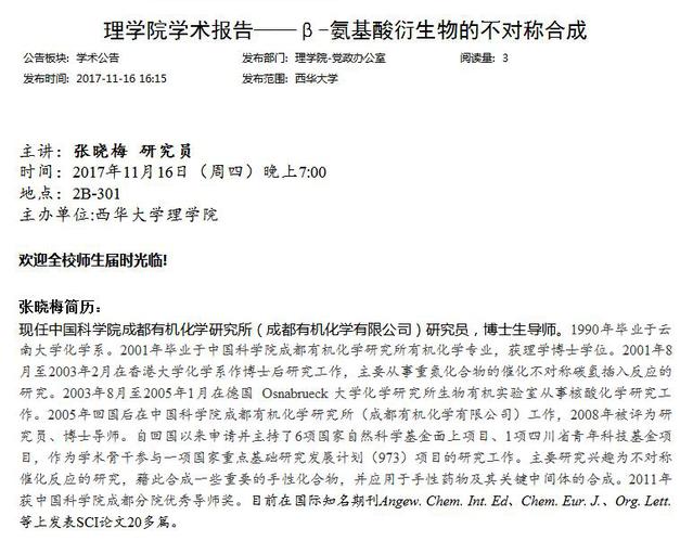 【2017年11月16日】中国科学院成都有机化学研究所(成都有机化学有限公司)研究院张晓梅研究员学术报告