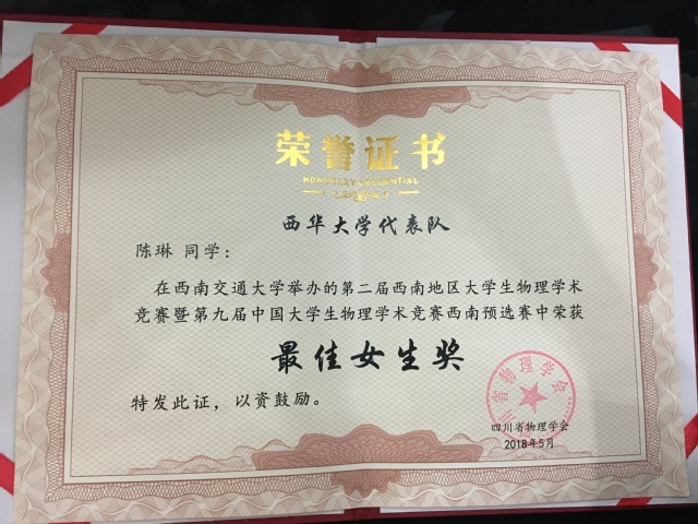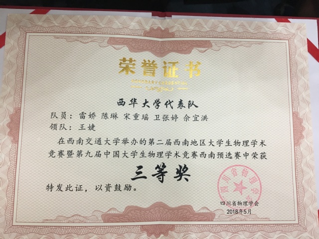 西南地区大学生物理学术竞赛(SWUPT)作为 中国大学生物理学术竞赛(CUPT)的西南预选赛,已经成为各高校参加CUPT的必经赛事。比赛以抽签分组、团队辩论的方式进行。赛前通过抽签分组,每支队伍参加三轮预选对抗赛,每一轮对抗赛共有三支队伍参加、分为三个阶段,三支参赛队在不同的阶段扮演三种不同角色,即:正方、反方和评论方,进行三个阶段的比赛。我校对该比赛十分重视,提前大约半年的时间开始准备。在前期通过面试选拔出了5位参赛选手,教练组的指导教师对参赛选手进行了全过程的指导与培训,使参赛队员熟悉竞赛规则、竞赛内容等,学生的动手能力、辩论演讲能力得到了很大程度的提升。最终,我校参赛队伍在迭东老师、徐勇根老师、王婕老师带领下荣获团体三等奖,其中陈琳同学获得最佳女生奖。