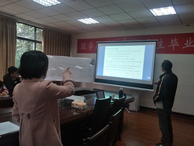 报告开始,王明新教授直接切入主题,会上,王明新教授主要讲解带两种化学物质的抛物-椭圆趋化方程组解的局部存在性和唯一性。分别考虑在空间维数不同的情况下,对于初值的不同要求,从而证明解的局部存在性和唯一性,其中就要利用Neumann热半群、估计、嵌入定理等方法来解决相应的问题。