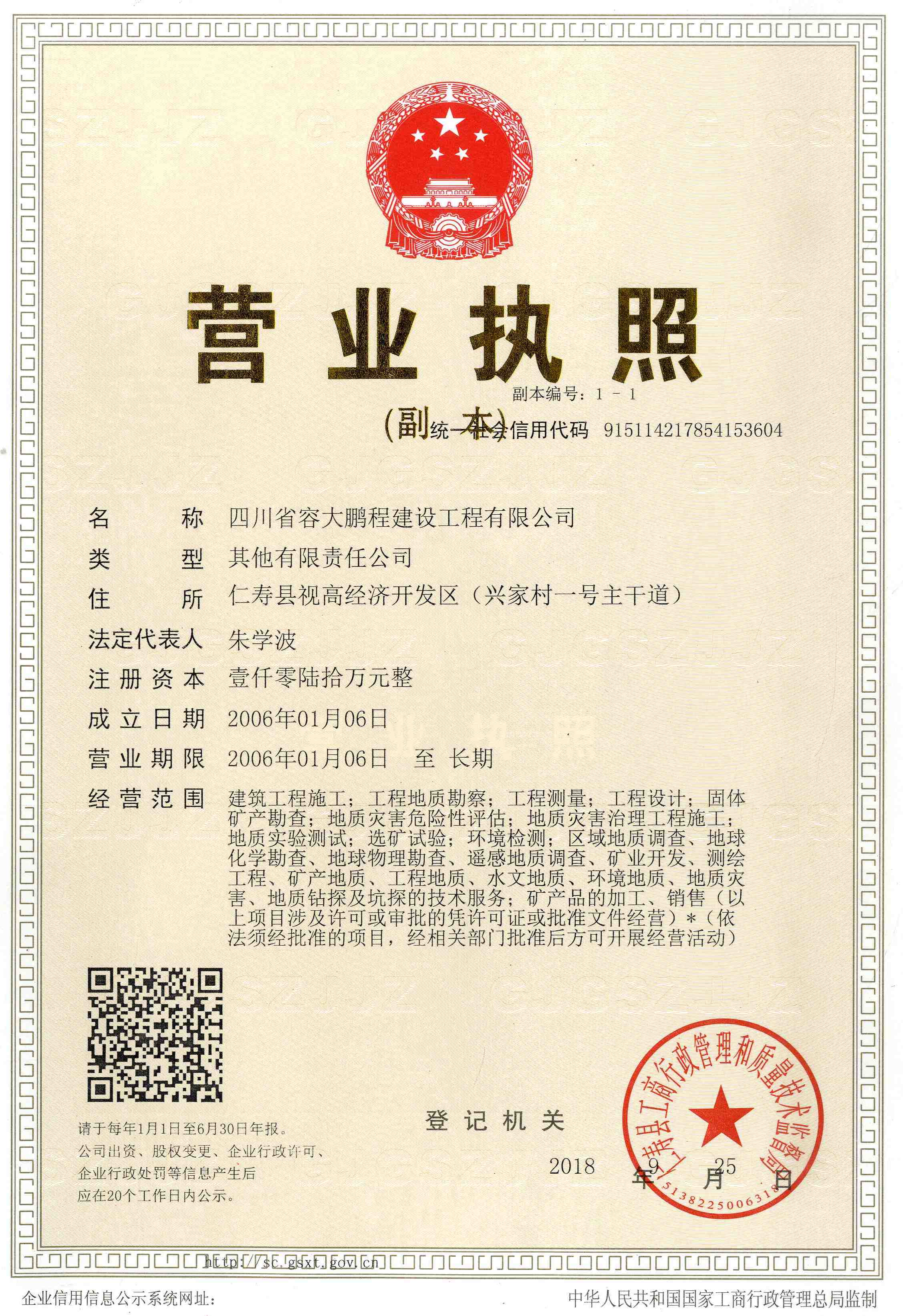 四川省容大鹏程建设工程有限公司成立于2006年,注册资本为1060万元,经营范围包括:建筑工程施工;工程地质勘察;工程测量;工程设计;固体矿产勘查;地质灾害危险性评估;地质灾害治理工程施工;地质实验测试;选矿试验;环境检测;区域地质调查、地球化学勘查、地球物理勘查、遥感地质调查、矿业开发、测绘工程、矿产地质、工程地质、水文地质、环境地质、地质灾害、地质钻探及坑探的技术服务;矿产品的加工、销售。