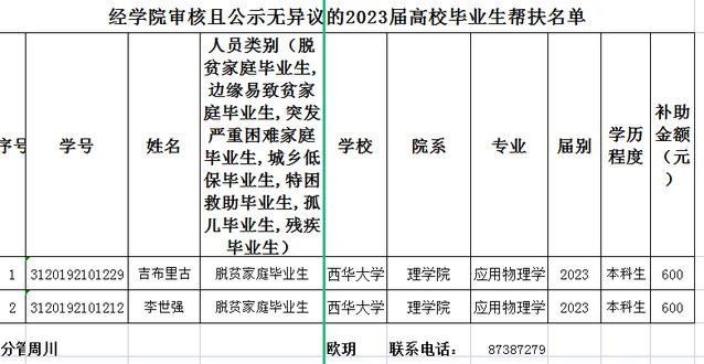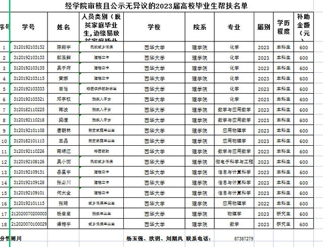 根据《西华大学2023届毕业生就业帮扶经费发放工作通知》要求,经学生申请,小组评议,现将结果公示如图,公示时间为2023年4月28日-5月8日,如有异议,请电话联系:028-87387279.